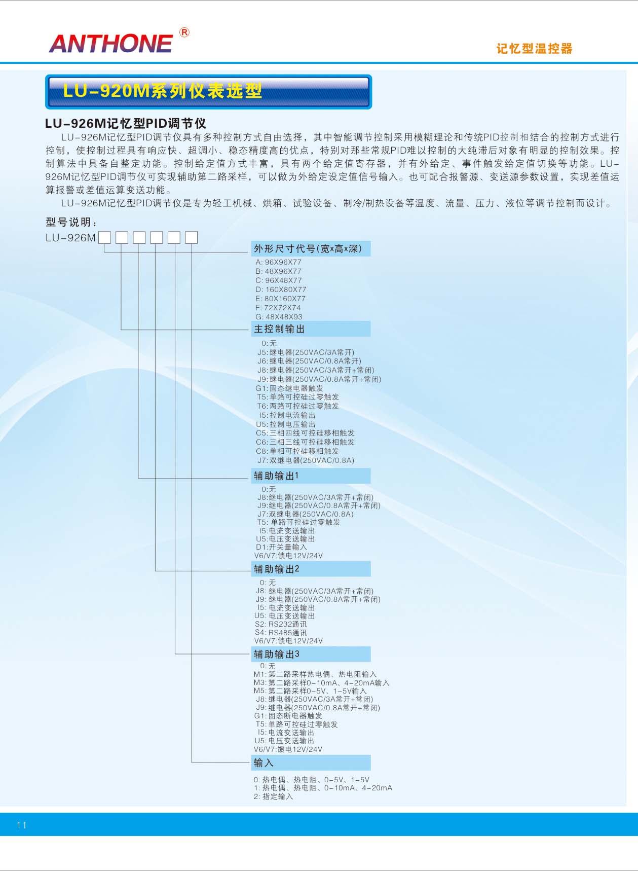 LU-926M智能調(diào)節(jié)儀是一種采用全新設計理念的高性能、高可靠性智能型工業(yè)調(diào)節(jié)儀表。專為輕工機械、烘箱、試驗設備、制冷/制熱設備等溫度、流量、壓力、液位等調(diào)節(jié)控制而設計