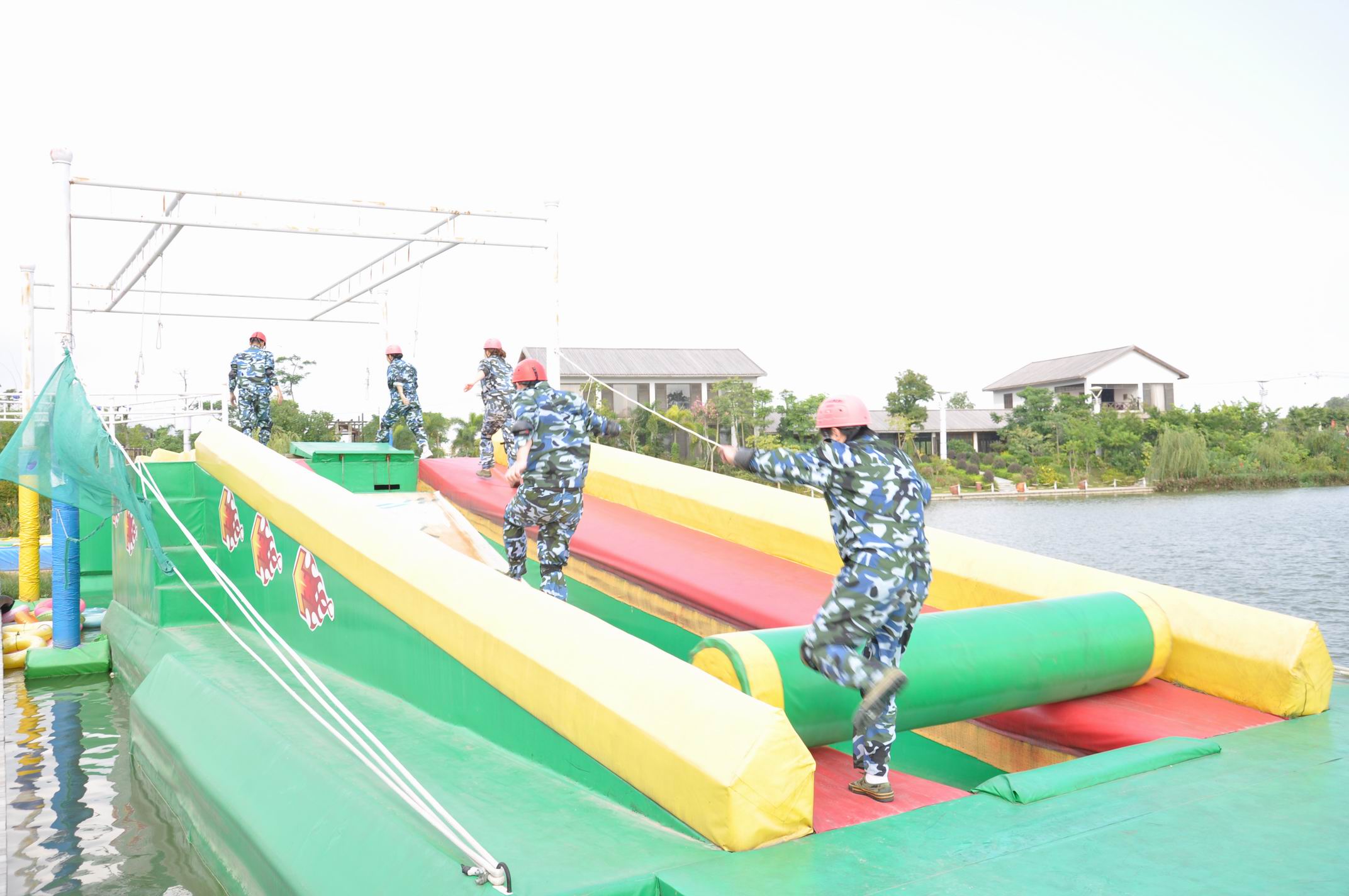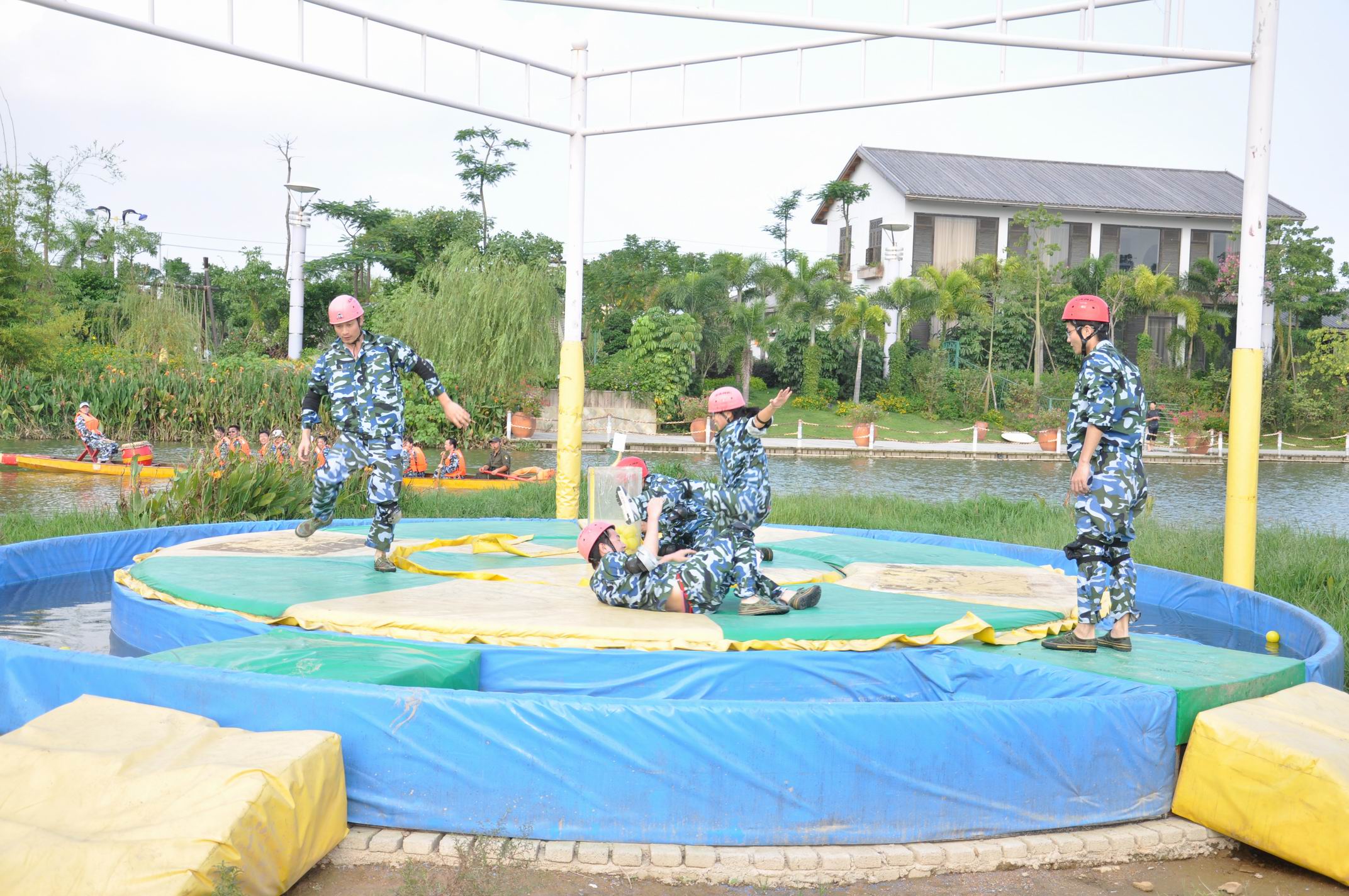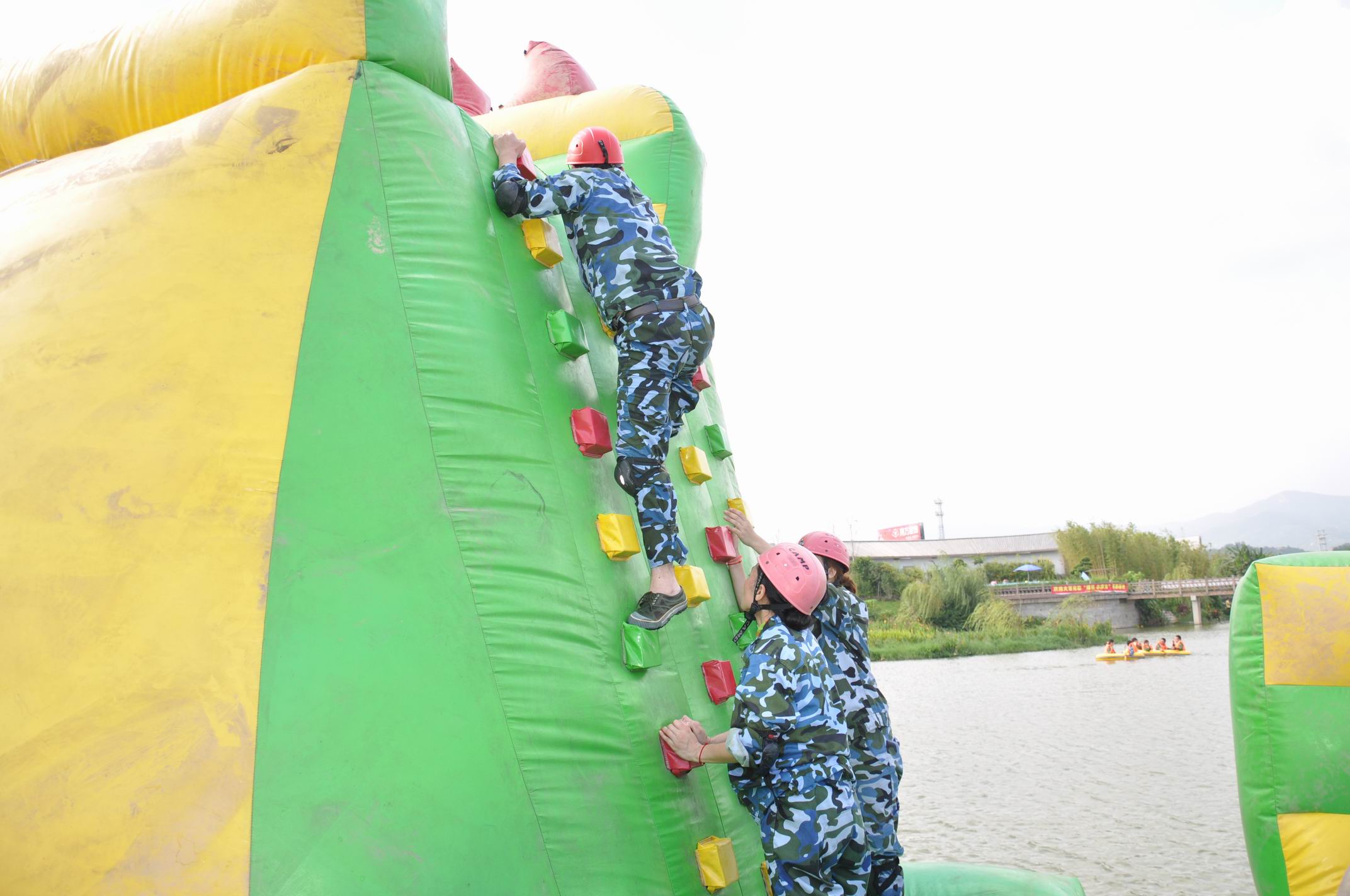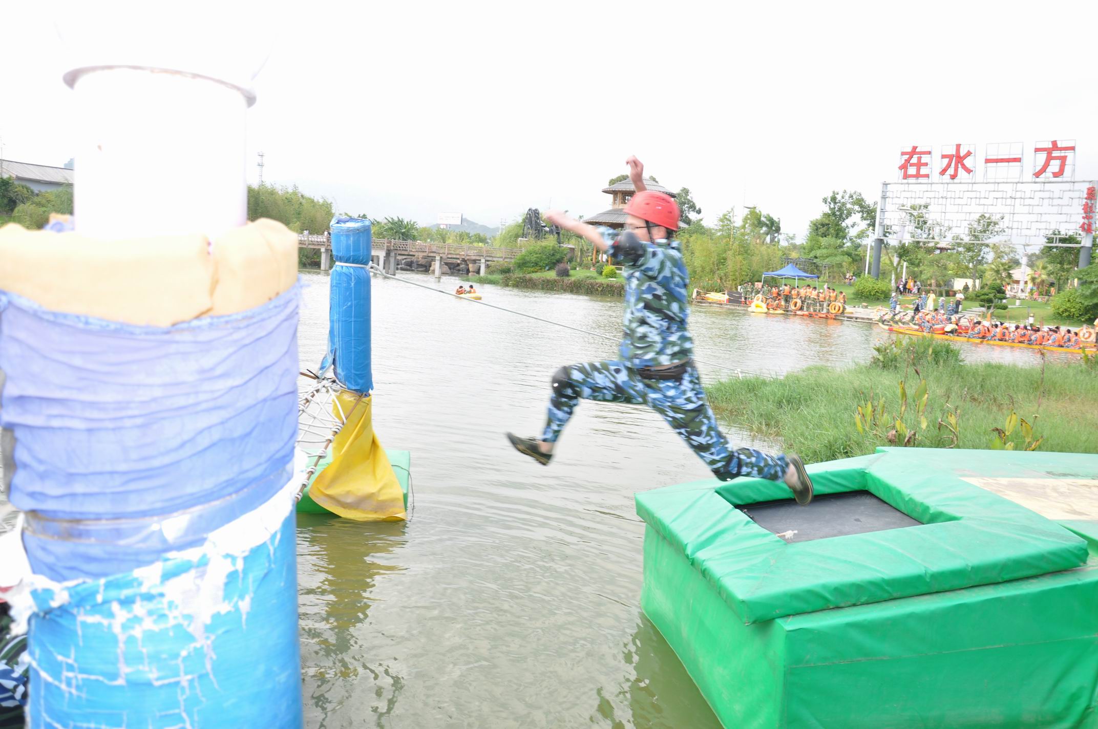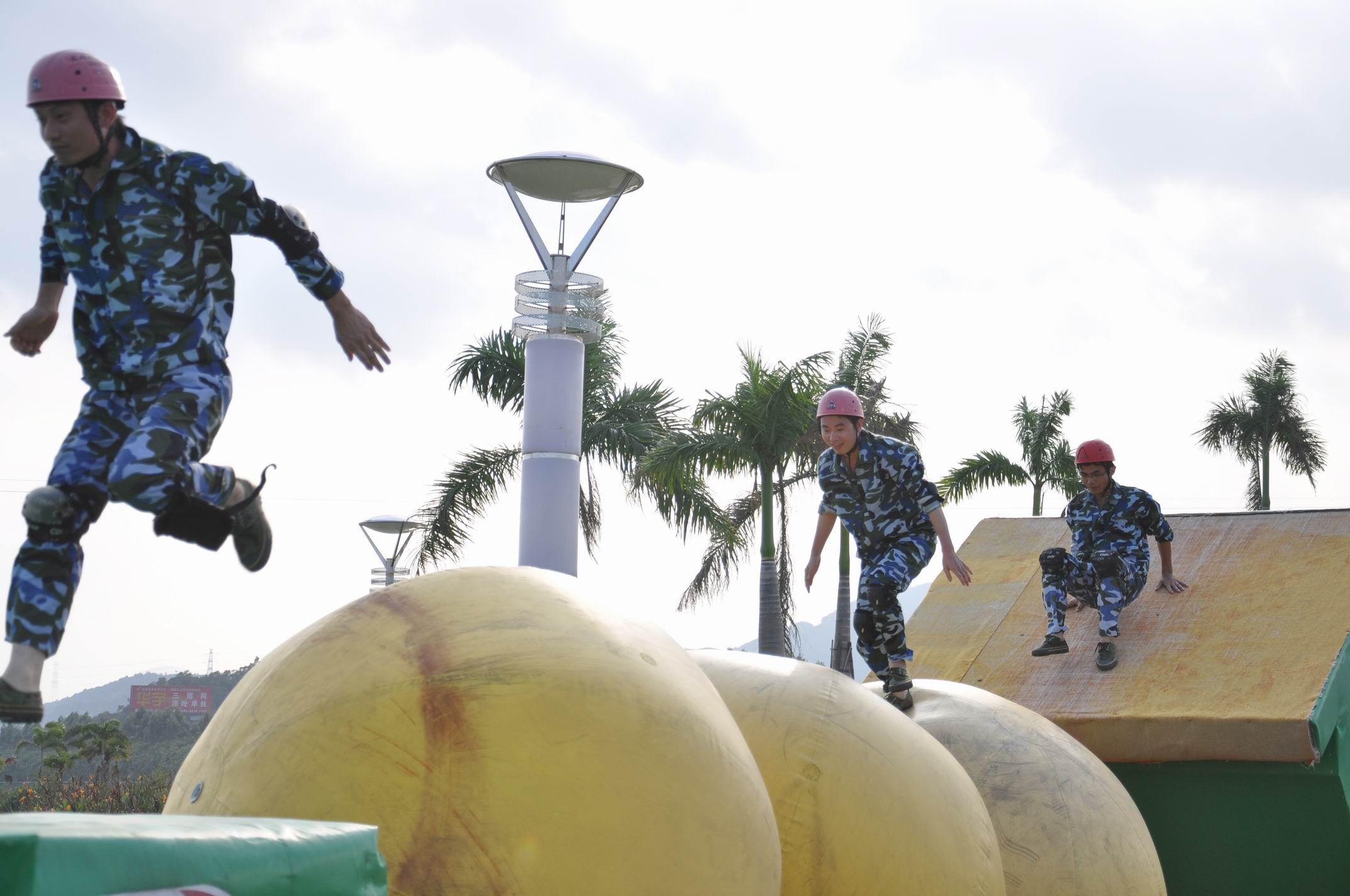我們第四小組是第四組出場。這就有機會多看看前面幾組的闖關經(jīng)驗,汲取下經(jīng)驗。第一組在最后第三關卡時候全軍覆沒,全體“濕身”。悲催??!引起很多人的嘆息和反思。炮灰就是悲劇啊!炮灰的人你們傷不起!接著,第二組出戰(zhàn)!由于該組女子占99.99%,所以出戰(zhàn)陣型就全裝——全部女子。誰說女子不如男,四個女子表現(xiàn)很鎮(zhèn)定,也很勇敢,最終在一陣精彩喝彩中完美完成挑戰(zhàn),無人“濕身”,起了個好兆頭。第三組,正常隊形,一人在第一關卡落難“濕身”,一人在轉(zhuǎn)盤落難“濕身”,其余通過!最后一組輪到我們了。不得不說,看前幾組闖關的時候,我心臟也沒這么鼓蕩,撲通撲通地亂跳。深呼吸,深呼吸,走!去“濕身”吧。我們組三男二女開始了挑戰(zhàn)巨龍島。不幸的是我們?nèi)齻€男子中小蘇叫我第一個上。好吧,早跳早“濕身”。第一關卡:必須蛙跳到彈性球上,而且是連續(xù)兩個,中間一個彈性板。慢慢來,我強壓心慌,在一片驚呼聲中險險地安全著陸,再一聲疾呼聲中安全著陸,很幸運,我們?nèi)凶尤客ㄟ^第一關卡。然后是和二女接應合作過獨木橋,爬轉(zhuǎn)盤,扔彈球,越絲網(wǎng),跳小艇,滑扶梯,上山巖,各中險象環(huán)生,一波三折,跌宕起伏,驚呼聲一浪接著一浪,最終也是完美地全部通過無人“罹難”,位居本批比賽的準榜首!通過這項勇闖巨龍島比賽關卡,我們這組壯士們個個灰頭土臉的,但是很欣慰。在闖關過程中的那種配合默契,彼此互扶最終迎接勝利的體驗還是很棒的!