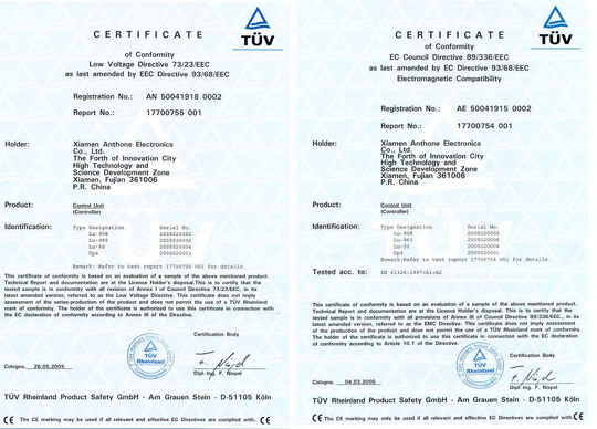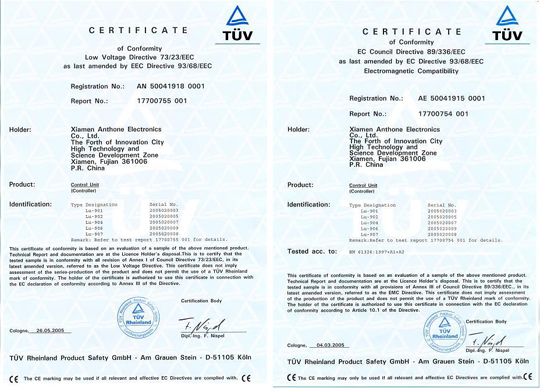 熱烈祝賀廈門安東電子有限公司獲歐盟CE認(rèn)證(LU-901,LU-902,LU-904,LU-906,LU-907,LU-908,LU-960,LU-50,DP4)