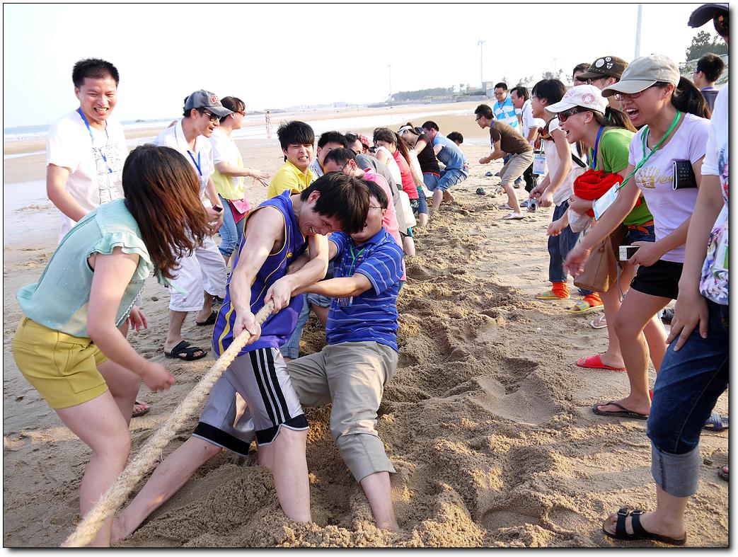 在30分鐘中之后,同事都把自己的帳篷搭好了。正是夕陽西下,海水一會兒波濤洶涌,一會又風(fēng)平浪靜,復(fù)雜多變不但沒有影響同事們的游興,反而讓大家見識了與平時不般的海灘夜景,同事們有的一時迎風(fēng)去浪,一時展臂潛游,不亦樂乎。幾分鐘過后,大家也都收拾好心情準(zhǔn)備接下來的拔河比賽了。終于輪到我們組上場了,我們的對手是第三組。王經(jīng)理把參加比賽的隊(duì)員按照從高到矮的順序排好,隨著裁判的一聲令下,比賽開始了。只見隊(duì)員們雙手一前一后,緊緊地攥住繩子,雙腳分開,用力蹬著地,身體向后傾斜著,一邊有節(jié)奏地高喊“一、二!一、二!”,一邊共同用力拉繩子。我們組的拉拉隊(duì)員一邊大喊著“加油!加油!”,一邊用手勢指揮著隊(duì)員們用力。只見繩子一會兒被我們拉過來,一會兒又被對方拉過去,僵持下去。就在這關(guān)鍵時刻,我們趁著對方放松的一瞬間,一把奪過繩子,我們贏了,進(jìn)決賽。在決賽我們面臨的強(qiáng)大的二組隊(duì)員,在前面我們都耗用了太多的體力,所以在決賽我們就一局輸贏。決賽開始了,隊(duì)員們心往一處想,勁往一處使,其他同事也不停地吶喊助威:加油!加油!隊(duì)員們憋足了勁,拼命地用力拉繩子。終于,在大家堅(jiān)持不懈的努力下,我們贏了。比賽結(jié)束了,我們組拿到了第一名,我們集體合照,讓大家留下一個美好的回憶。同事們都覺得這次活動很有趣。大家紛紛表態(tài):今后要好好鍛煉身體,下次再有這樣的活動,我們一定要爭取得冠軍!