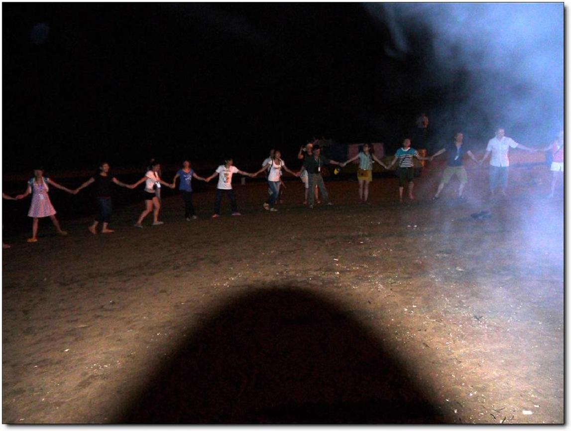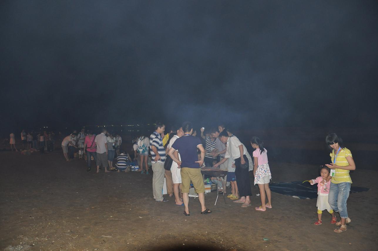 其實(shí)真正好玩的應(yīng)該是晚上吧,一開始是圍著準(zhǔn)備著晚餐,吃完以后就是一個似乎沒有什么創(chuàng)意卻讓大家都很開心的節(jié)目---篝火晚會。其實(shí)這種大家都圍坐在篝火前玩著簡單但有懲罰的游戲,吃著零食,聊天的感覺還真的是很不錯.雖然會被煙吹的流眼淚,但篝火把每個人的臉都烤的紅紅的,而寒冷的海風(fēng)也似乎消失了。守夜的篝火已燃到第二把,深夜海上的寒氣催促著我們的臉。躺在黏黏的防潮墊上,聽著海的咆哮,那巨大的聲響好似要把我吞沒?;炭种心枪上滔痰臍馕对诒乔痪従徲问帲媸莿e有一番風(fēng)味。接下來就是燒烤了,有的同事在海邊戲水正酣,有的同事那邊熊熊的燒烤爐已經(jīng)點(diǎn)燃,香滑雞翅、可愛的士豆、清香的玉米、清甜的韭菜、肥肥的茄子,紛紛上陣,哇哇哇、真是讓人忙不過來,不知先吃哪樣才好。但我還得接受炭火的“炙烤”不斷鍛煉自己的燒烤技巧,我們吃著喝著玩著,長大了又何妨?我們的心還年輕著呢!就在這時一片海灘只聽見海浪與我們的歡笑聲。