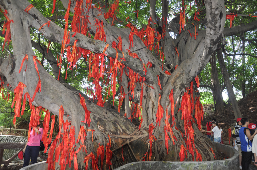 迫不及待的想登上游船前往小嶝島,一覽這距離金門只有1600余米的島嶼。為了防止人員走散或發(fā)生安全問題,旅行社為每一個人都準(zhǔn)備了一頂設(shè)計獨特的旅游帽,我們戴上它,分成幾個小組正式開始旅游。首先,參觀的是小嶝島地底下的縱橫交錯的坑道,一千多米長的秘密坑道橫貫小嶝全島,要想獲得現(xiàn)在如此的平靜與安詳是多么的不容易。接著在導(dǎo)游的陪同下,我們一行來到了英靈殿,參觀了有著六百多年樹齡的“八閩鐵樹王”, 樹干上分出了三支粗大的分枝,彎彎曲曲伸向不同方向,似龍又似鳳,大家認(rèn)真的聽著導(dǎo)游講解著其中的故事。據(jù)說這顆鐵樹每年都開花,吉祥的寓意給當(dāng)?shù)鼐用駧チ讼楹团c寄托,為了留住這美好的瞬間,有人舉起相機捕捉了這個最美好的風(fēng)景。
