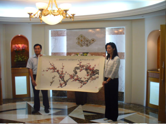 20日,結(jié)束臺(tái)塑參訪,秘書長(zhǎng)徐模代表參訪團(tuán)向王永慶大女兒臺(tái)塑關(guān)系企業(yè)行政中心副總裁王瑞華贈(zèng)禮